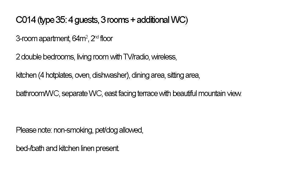 These apartments with 3 rooms accommodate 4 persons. We rent 4 apartments of this type. In the gallery you can view all the apartments along with floor plan and description.