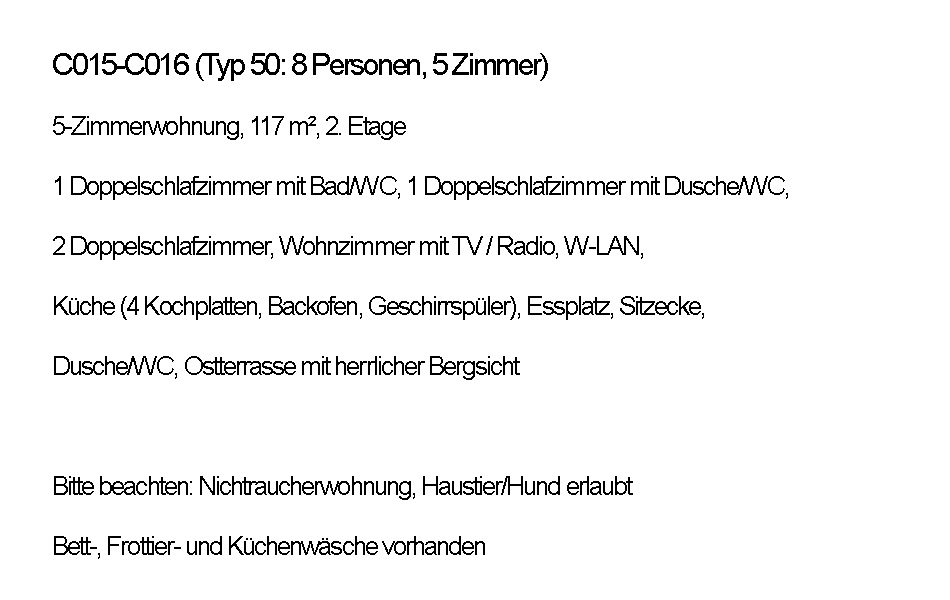 Diese Wohnung mit 5 Zimmer bietet Platz für 8 Personen. Wir vermieten insgesamt 1 Wohnung dieses Typs. In der Galerie können Sie sich diese Wohnung mitsamt Grundriss und Beschrieb ansehen.
