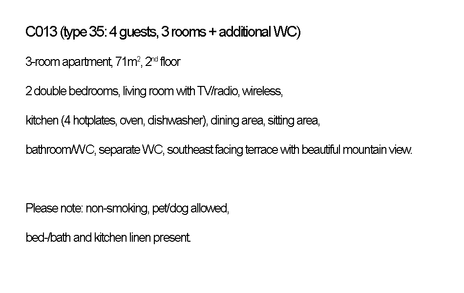 These apartments with 3 rooms accommodate 4 persons. We rent 4 apartments of this type. In the gallery you can view all the apartments along with floor plan and description.